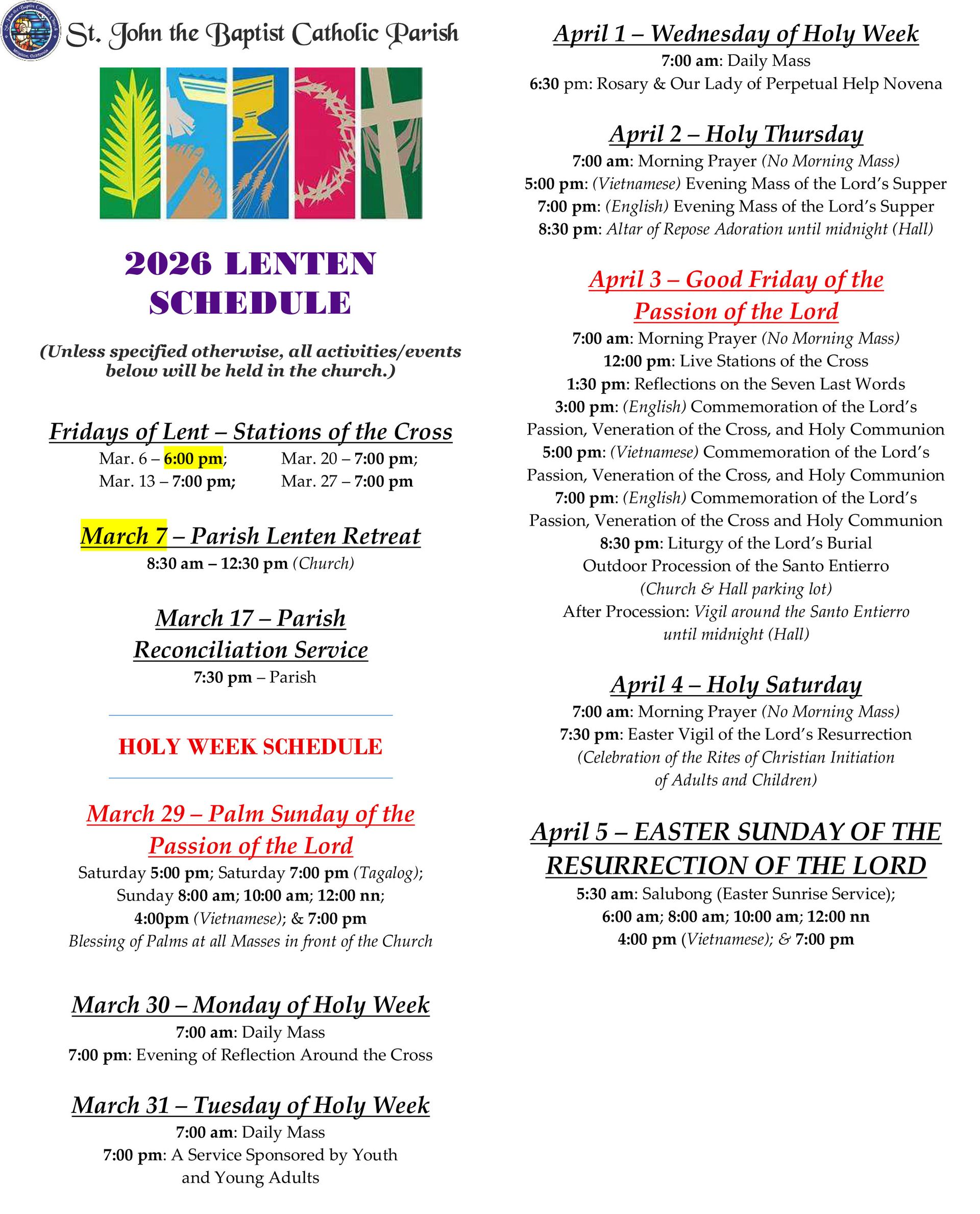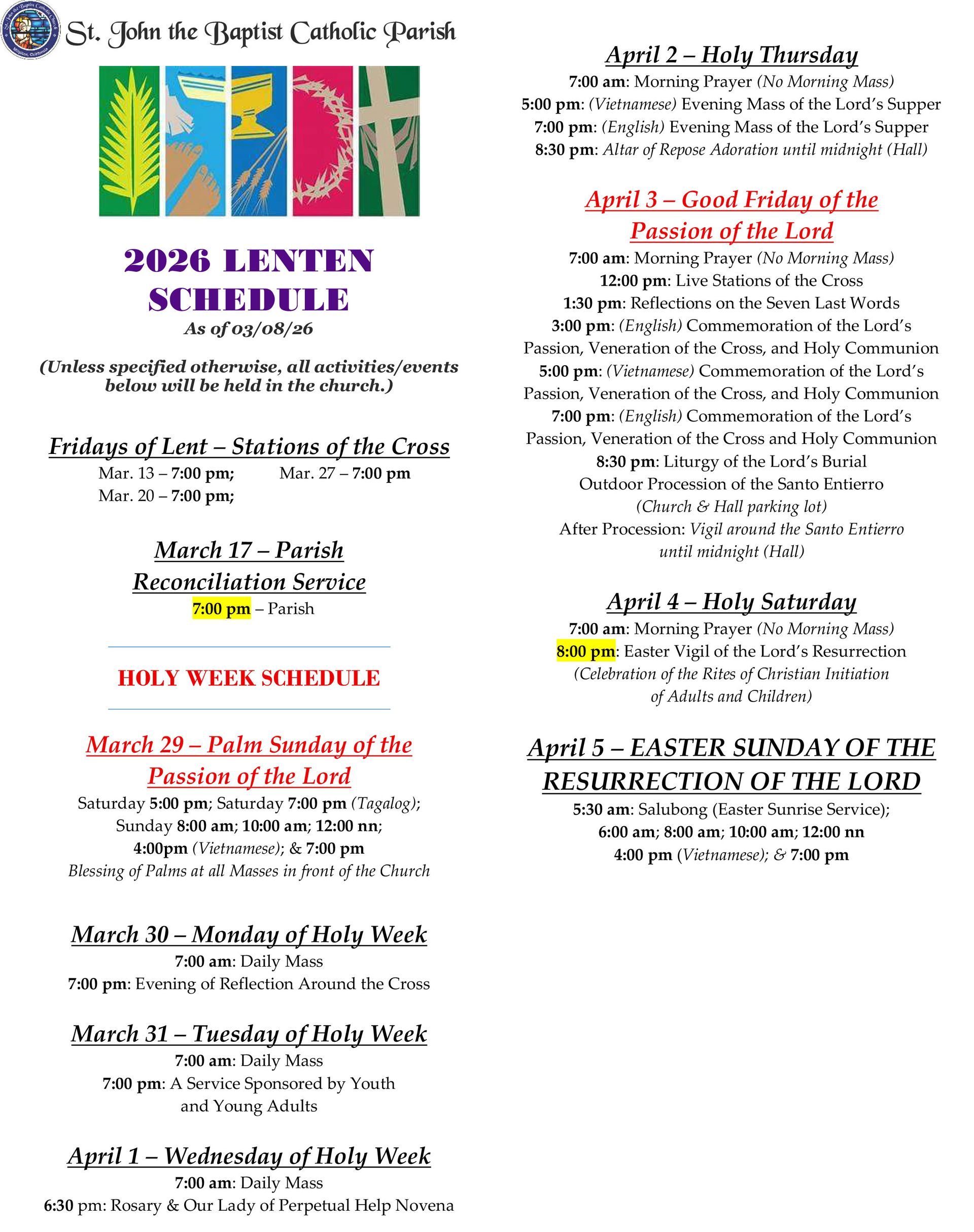 Sunday 8:00am, 10:00am (Livestream) 12:00pm, 4:00pm (Vietnamese), 7:00pm